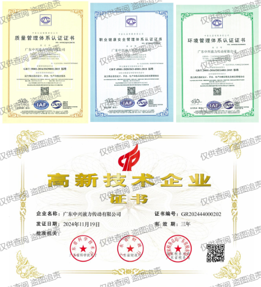 廣東中興液力傳動有限公司作為高新技術(shù)企業(yè),始終堅持以質(zhì)量求生存,以創(chuàng)新求發(fā)展。公司目前已獲得2023年質(zhì)量管理體系認(rèn)證證書、2024年職業(yè)健康安全管理體系認(rèn)證證書、2024年環(huán)境管理體系認(rèn)證證書及2024年高新技術(shù)企業(yè)證書,體現(xiàn)了公司在產(chǎn)品質(zhì)量、管理水平和技術(shù)創(chuàng)新方面的綜合實力。
